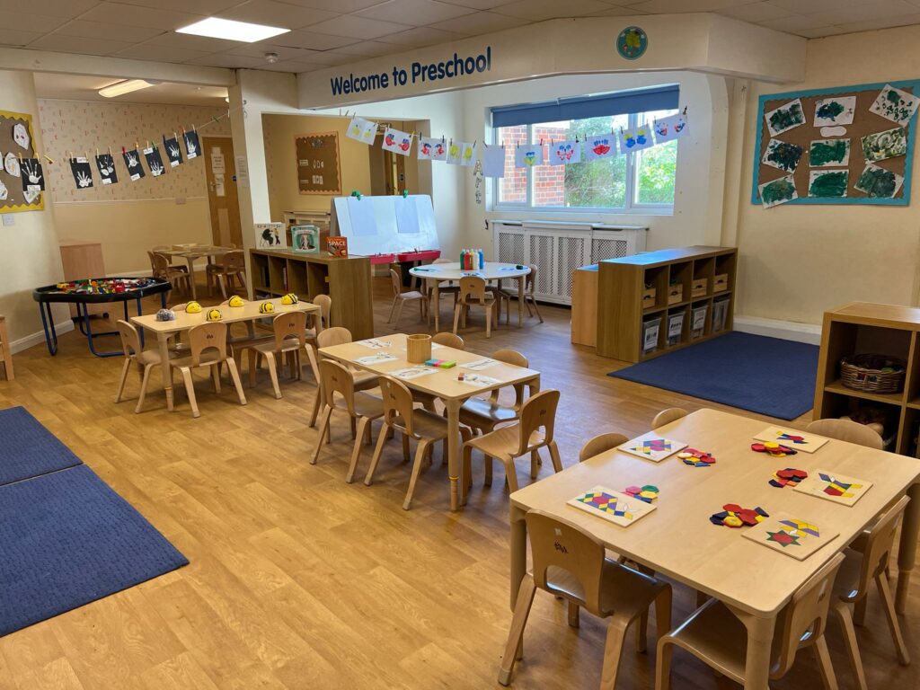 Our Pre-School children have their own age appropriate resources, free flow access to a well equipped outside play area and brightly decorated children’s toilets. To encourage independence, children are assisted with activities such as pouring drinks, serving food and laying the table.